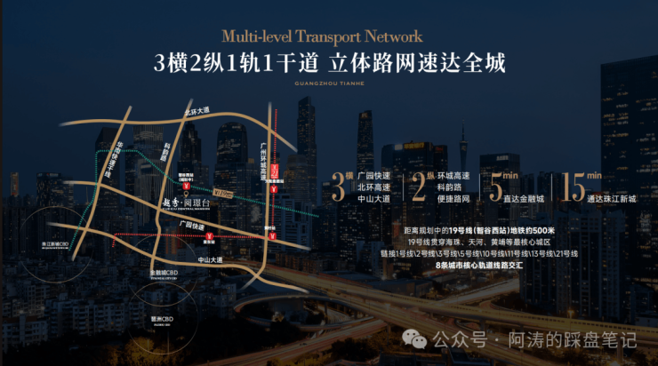 3 横 2 纵主干道环伺,家门口规划天坤三路直通科韵路;约 1km 达 21 号线棠东站,近规划 19 号线智谷西站,未来 4 站珠城、6 站琶洲