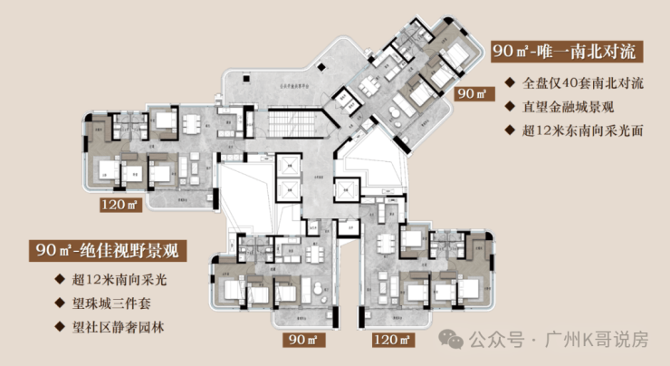 设计好处是既保证了通风、采光,还保障了侧向江景和珠城景观的最大化。