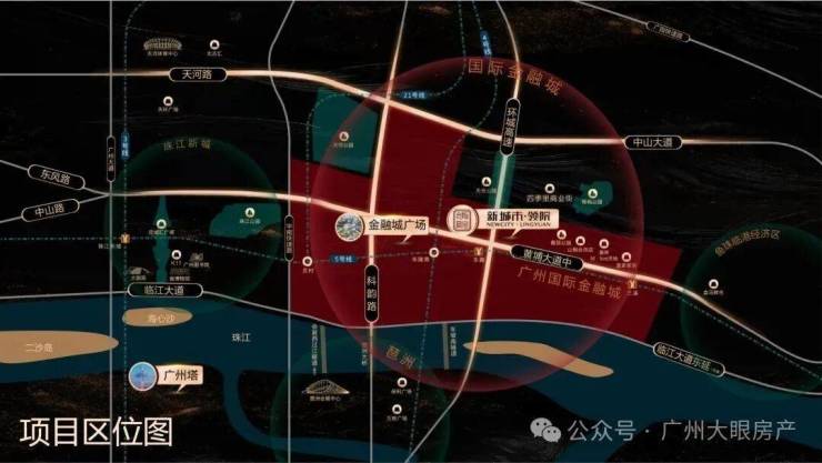 新城市领院位于黄埔大道的北侧,靠近鱼珠,南向望江,和金融城东区直线距离约300米左右,跟兰亭盛荟只有一路之隔。