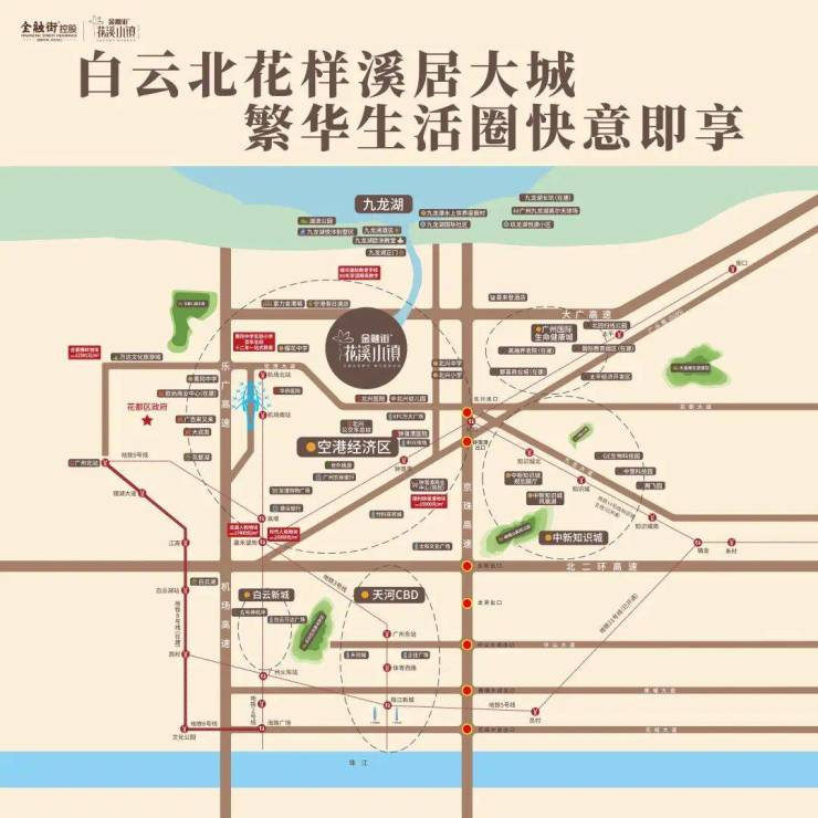 金融街·花溪小镇所属区域教育、商业、医疗多元产业高密度聚集,10分钟车程可达黄冈中学广州学校试验小学、耀华国际教育学校、北兴小学、榴花中学、北兴中学、万大广场,项目自带花东镇中心幼儿园榴花分园已开学;此外,小区规划2400㎡英伦主题商业街,约1. 3万㎡社区配套,美宜佳、菜鸟驿站已相继开业,满足生活各方面需求。