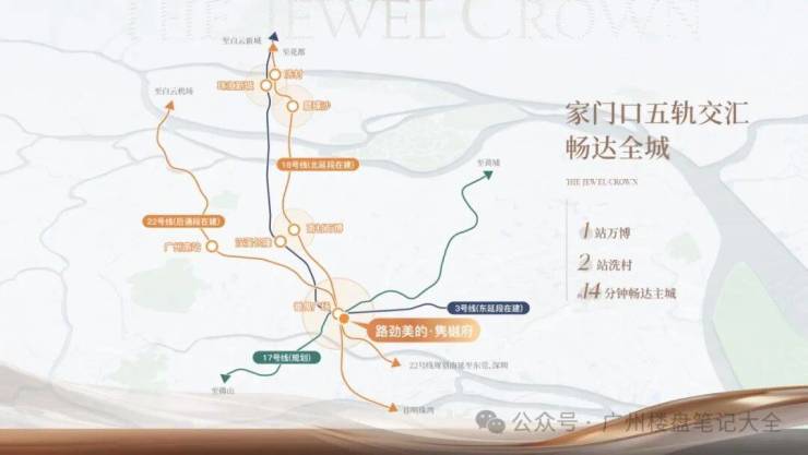 五轨交汇,家门口地铁3号线/18号线/22号限/17号线(在建)/3号线东延线(在建),1站万博、2站珠江新城,直通南沙、联动广/佛/莞的核芯节点,畅享湾区1小时生活圈。