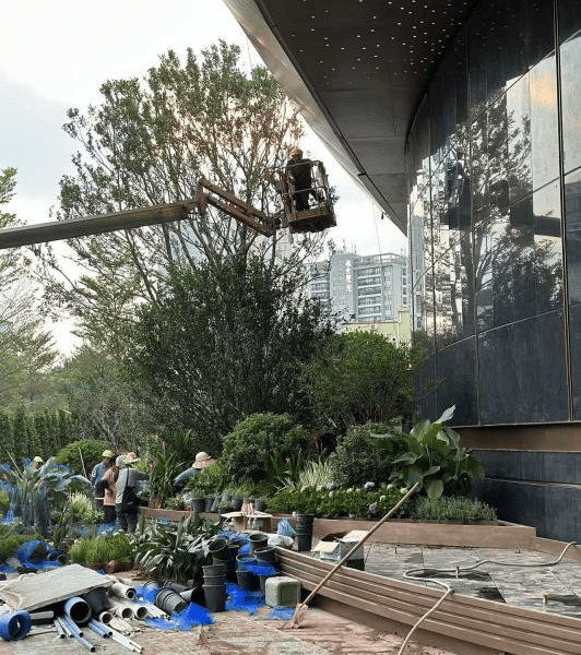 在苗木甄选上,选苗阶段对冠幅、干径、根部土球等8项严格标准精挑细选,耗时数月锁定了最优植株,到场后二次筛选,确保每一株苗木都能“落地即成景”,精准匹配自然环境的绿色生态系统,展现出现代质感与东方意境的融合。