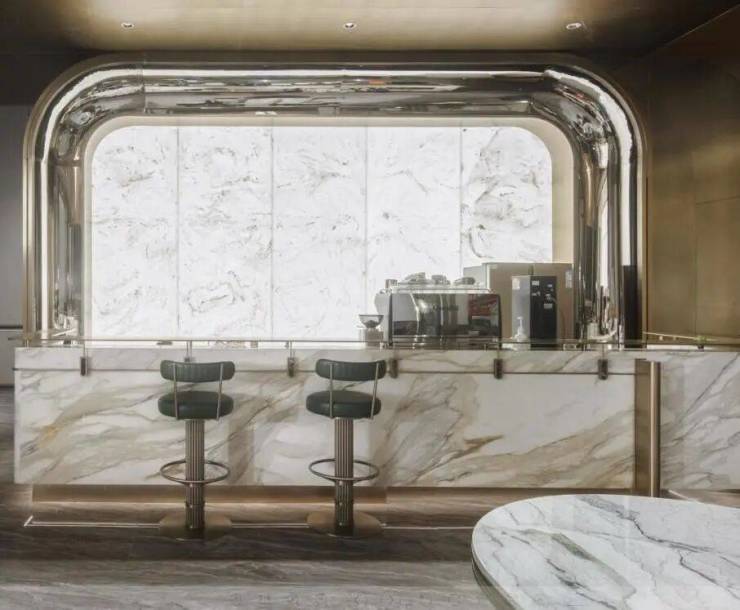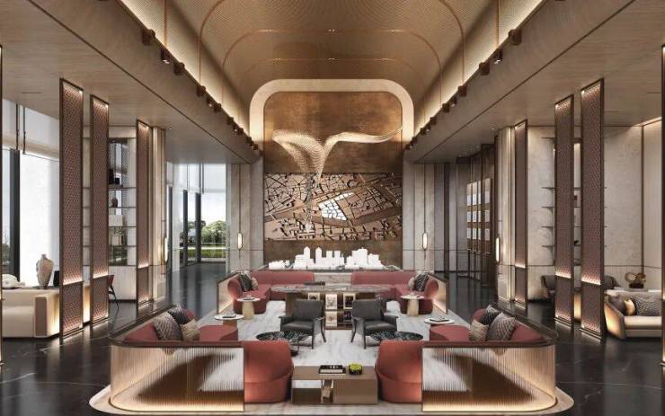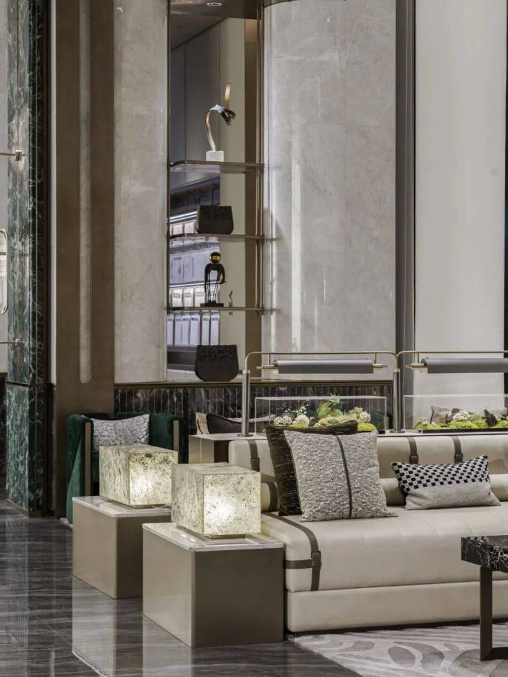 在方案设计阶段,设计团队采用现代轻奢风格,结合广州岭南在地元素,如镬耳屋、雕窗、石材拼花,同时结合骑楼建筑、建筑穹顶等元素,用现代的设计语言表达对广州中西合璧的历史记忆。