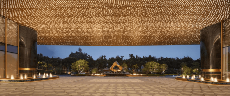 雕塑水景《洄》以“岸际时光的时空对话与转换”为核心,诠释着“时间在洄游中穿透”的哲思。雕塑扭转翻腾却又归于原点,表达了一种水岸来去的溯洄与追寻。冲孔细节结合灯光设计,晚间透过缝隙泛出金色光影。水生于此又回落于水面,代表了东方原生岸际情结的归宿与融合。