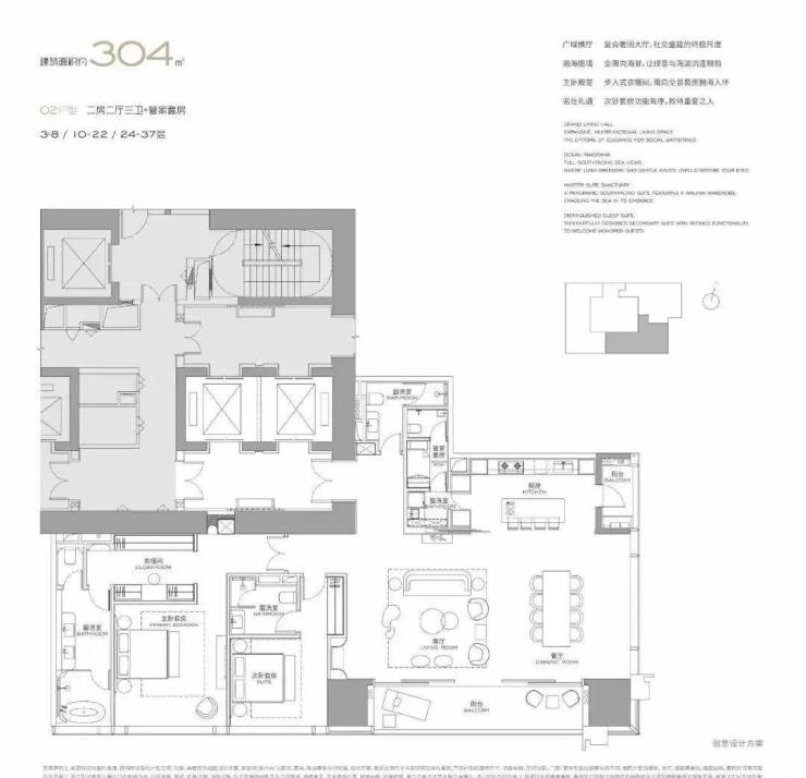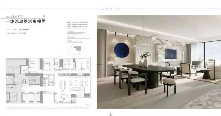 三百平做两房,在深圳应该是独一份的设计了,确实是非常奢享的定位!横厅客餐厅一体,尺度还是比较够,厨房旁边有独立生活阳台,两个套房设计,主卧步入式衣帽间。
