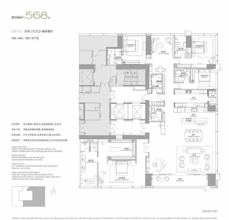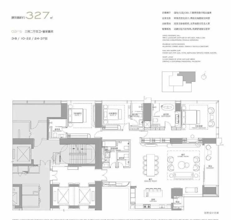 南北通透三面采光,顶奢总统套房规格,270°全景套房,享受湿地/公园/CBD景观,都是套房设计,更具私密性,中西厨分离。