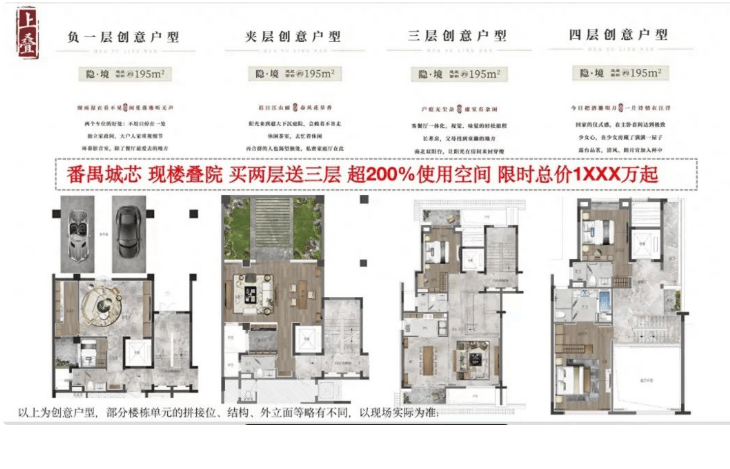 项目总规划共537户(含509套复式+28套叠墅),小区采用点状式布局,前后楼栋最大超百米楼间距,通风采光造景实现最大化。户型涵盖建面约110-128㎡复式四房以及建面约178-195㎡叠墅(上下叠)。