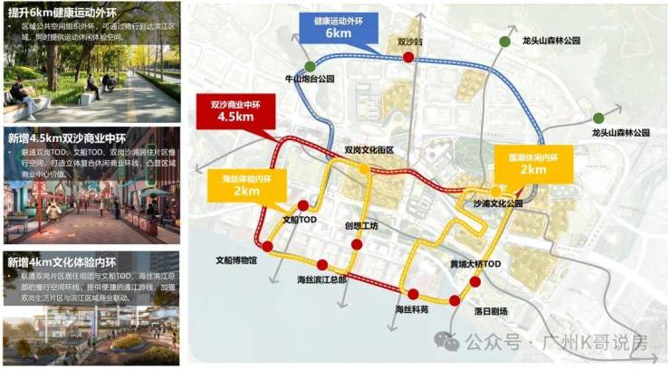 构建“两轴、一带、三廊、三环”的慢行系统网络,三环分别为6公里运动外环连接滨江,4.5公里商业中环连接华润万象系TOD商业,4公里文化体验内环连接各重要空间。