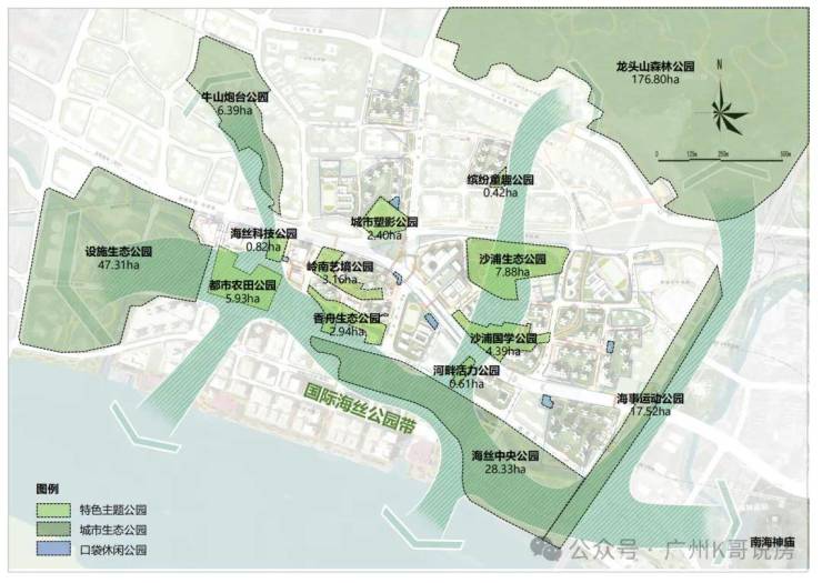 拥揽珠江一线景观、关键还是南向望江,这是连琶洲都做不到,还背靠5000亩龙头山森林公园,南望珠江水,山水相依,所开发地块约90%界面朝向公园,打造 300 米见绿,500 米见园;加上片区规划“5+9”的“公园城市”,一流生态环境实现出门即入园。
