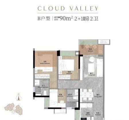 南北通透双阳台设计,瞰景阳台约6.9米,五开间朝南,主卧带独立衣帽间。