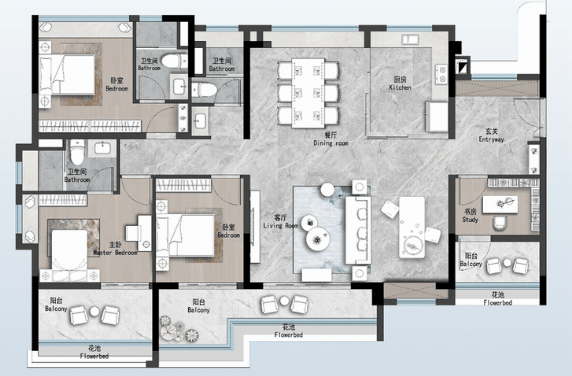 建面105㎡的四房两厅两卫,约6.2米宽景阳台,阔奢主套设计,LDK一体化。