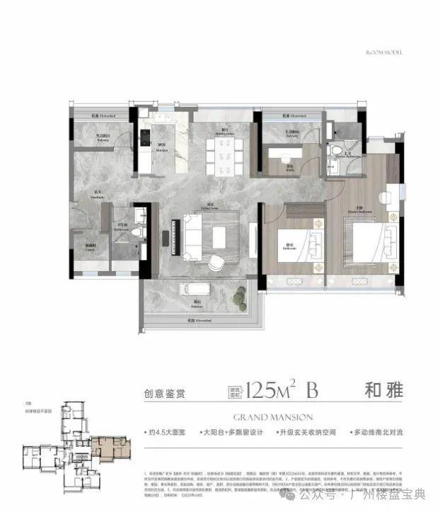 建面125平四房,LDKG一体化设计,L型独立岛台中西厨房,7米南向采光景观阳台,可改成四房两卫,步入式衣帽间。