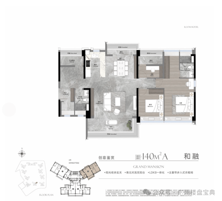 建面140平四房,动静分区、全屋全明设计,入户玄关,约8米双连宽景阳台,LDKG一体化设计,主卧小家化。