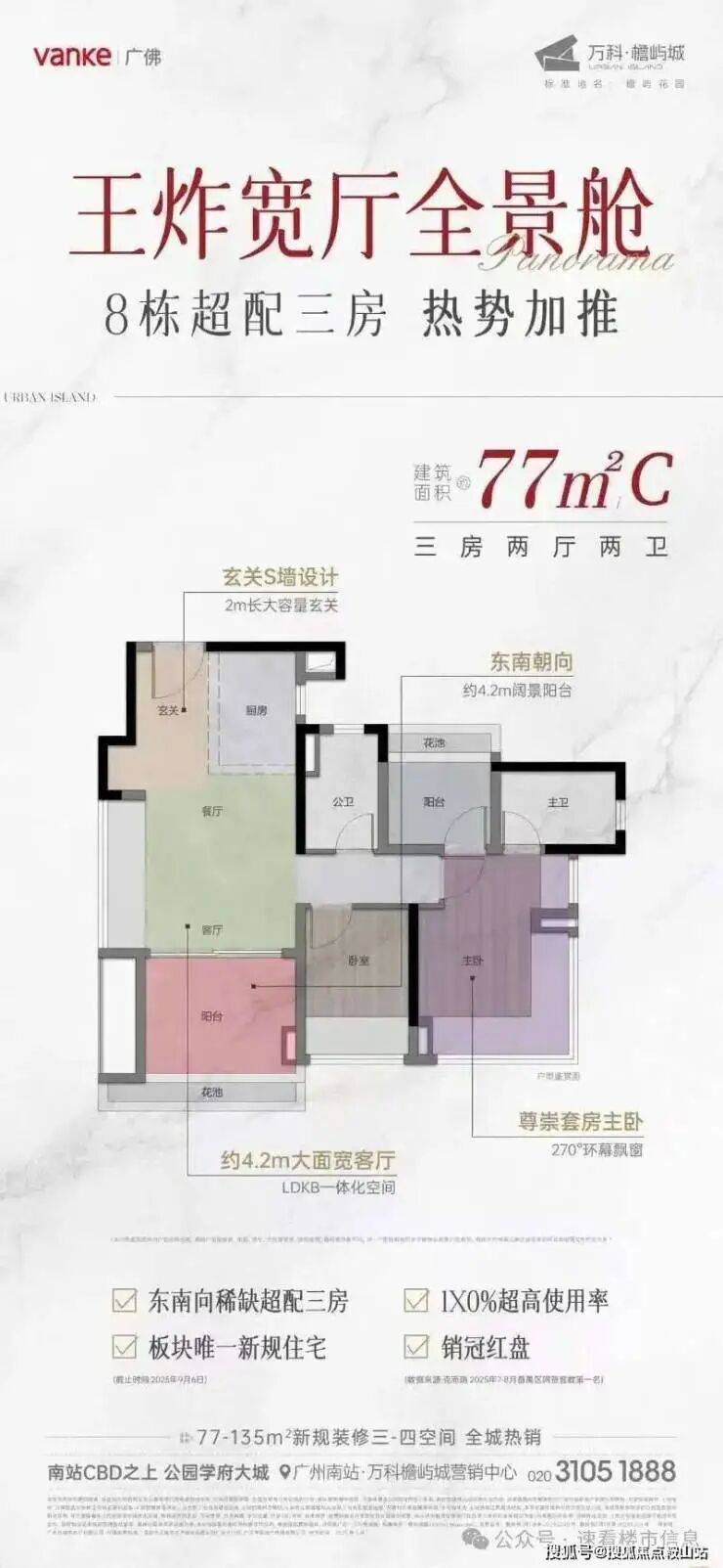 建面约77-135㎡三四房,四面宽南向,三房(最高)享约5米客厅,新规产品约127-137%高使用率,目前8栋做了升级,空间感会更好!