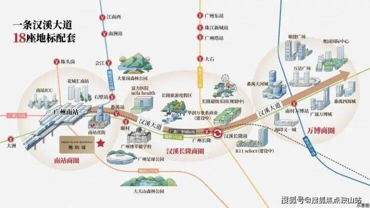 广州南站串联万博、长隆两大板块,以“超级枢纽+超级商圈”模式平移都市中心,南站8km范围聚集番禺70%的经济总量、70%的常住人口,拥有前沿的产业体系+集中的商业配套+宜居的生态资源+高效的通勤速度,是番禺最适合生活居住的组团,打造广州不可复制的“黄金动脉”。