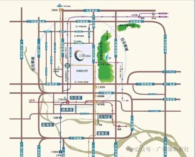 2号线直达广州火车站、广州南站、3号线5站即达白云国际机场、14号线连通白云及从化,未来更可直达清远、中山、珠海等地