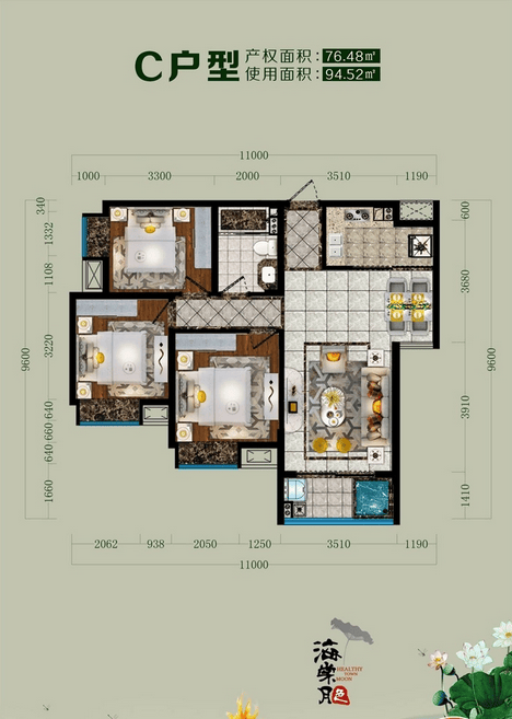 C户型建面约76㎡,三房两厅一卫