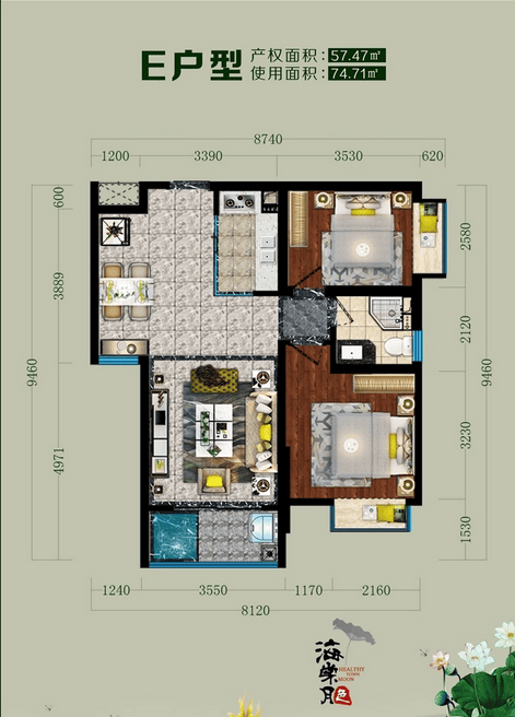 E户型建面约57㎡,两房两厅一卫