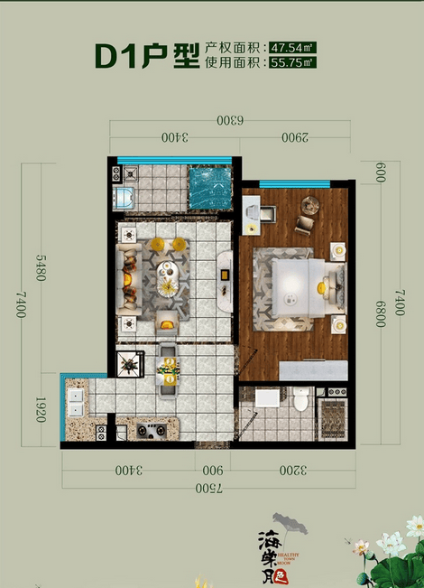 D1户型建面约47㎡,一房两厅一卫