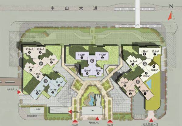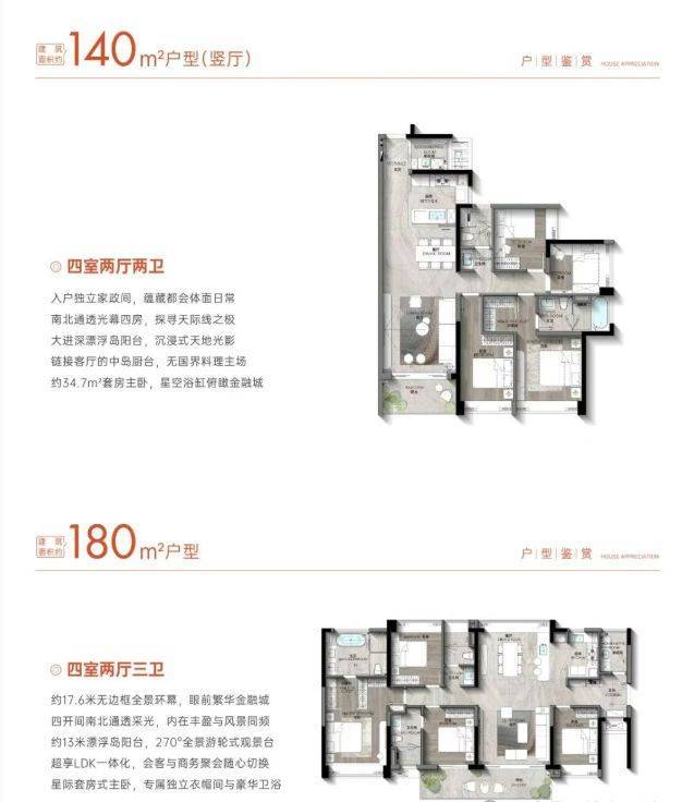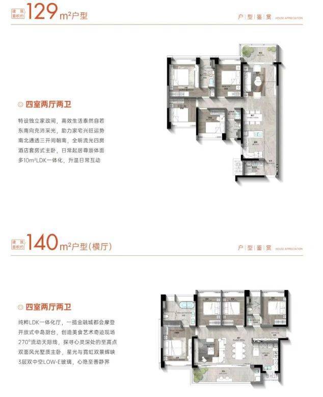 珠江天郦主力产品为建面约129–180㎡的纯四房大平层,共5栋住宅,总户数仅572户,容积率7.2,采用2梯3/4/5户设计,在保证效率的同时兼顾私密性。项目虽为高密度城区住宅,却通过精细化布局实现空间最大化利用,户型方正、南北通透,采光通风俱佳。