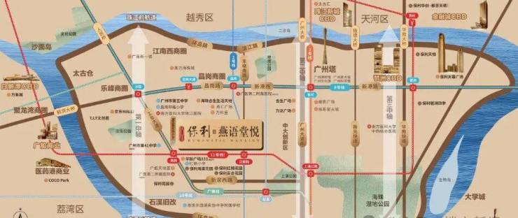 项目坐落于工业大道中,背靠珠江后航道,傲立于海珠新活力文商旅融合圈与广州市“首个”后航道服务型制造创新带交汇的核心地带,海珠后航道将成为海珠未来唯一连片开发的豪宅板块。环拥整个海珠乃至广州最顶尖的产业、商业、文旅资源,最为宜居的纯粹居住区,媲美“法国左岸”,凝聚海珠特有的文化发展脉络与基因,既能共享中央活力区和广佛高新技术园区双向红利,又能尽收老城醇熟烟火。