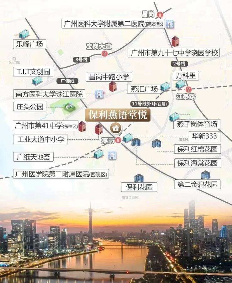 约50m燕岗站,广佛线、11号大环线(土建工程已完成98%,将于年内通车)双地铁上盖,4站达上涌、8站达琶洲,轻松链接全城。