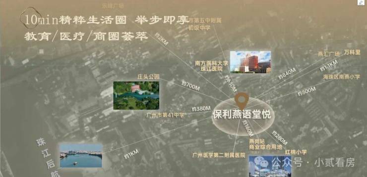 步行可达约700m海珠免费的庄头公园、约1.2km可达珠江后航道;900米3.6万方广纸历史公园、滨江公园,1.6公里广州志愿者公园、700米燕子岗体育场。