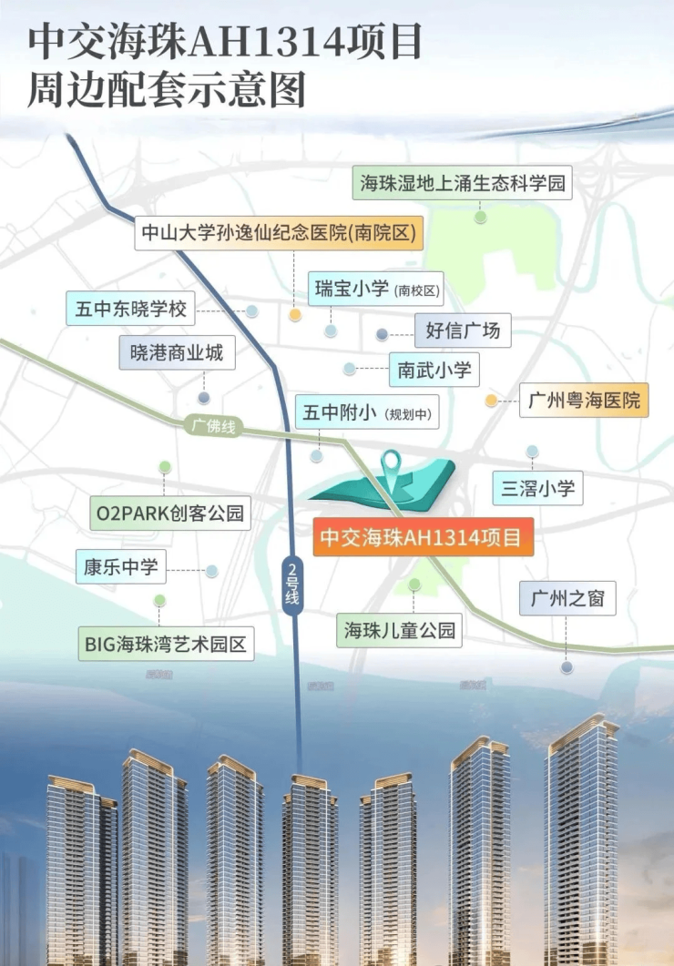 中学:直线 3km 范围内有 20 个中学,如广州市第五中学 (金碧校区)、洛溪新城中学、广州市劬劳中学等