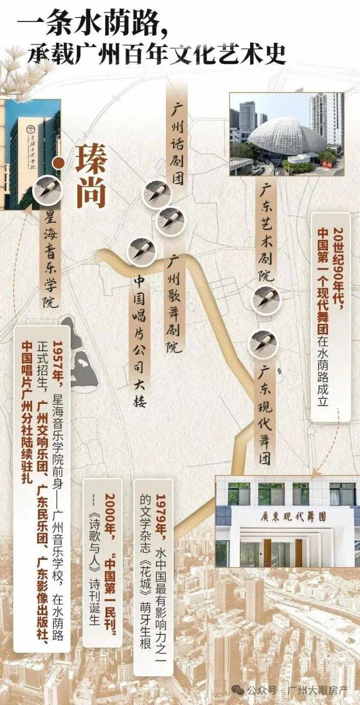 如今,短短1公里的水荫路,集聚广州歌舞剧院、广州话剧团、星海音乐学院、中国唱片公司大楼......数十家文化机构、上百位艺术人群。