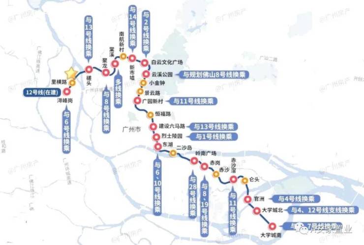 12号线: 浔峰岗 ~里横路~槎头~聚龙~棠溪……~官洲~大学城北~大学城南(预计2023年开通,途径白云区、越秀区、海珠区、番禺区 )