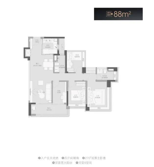 全屋4开间朝南,配置双面宽大阳台、270°环幕景观主卧套房等敞阔空间,加上少承重墙设计,实现了可变X空间。