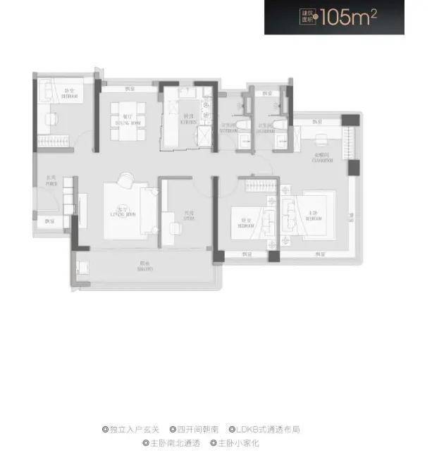 全屋4.5开间朝南,超强南北对流。一进门步入独立玄关空间,公区目之所及为LDKB一体化大通厅、可分可合餐厨空间,主卧套房三面环幕景观、通风,实现了沉浸式舒适体验。
