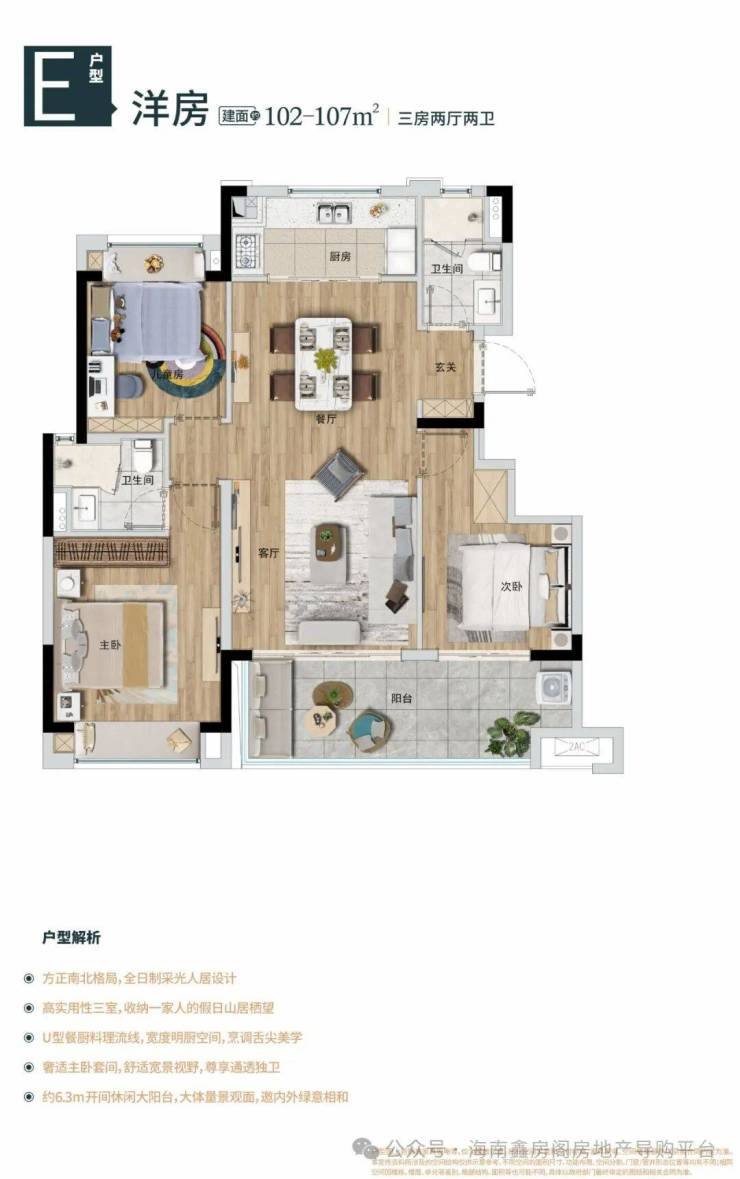建面约102-107㎡三室度假洋房,三房两厅两卫
