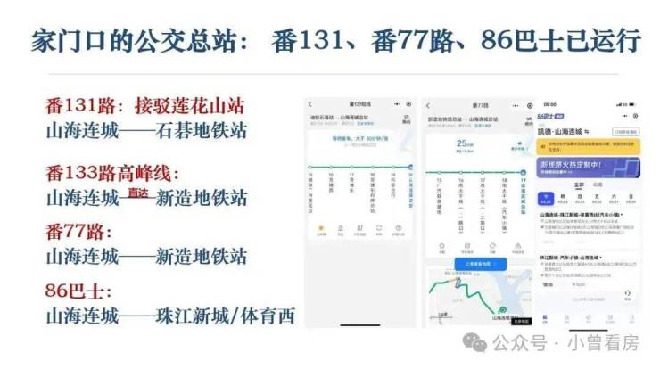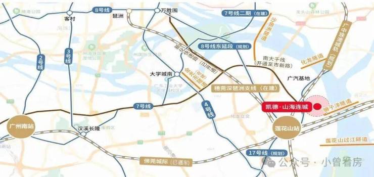 地铁交通:距离项目2.5公里处有莲花山站,佛莞肇城际已经开通运营了,3 站到长隆万博,4 站到广州南站。另外佛莞深城轨琶洲支线还在建设中,(2 站到大学城,3 站到琶洲)以及广中珠澳城轨(规划中)和8号线地铁的东延段(预计2027年通车)。