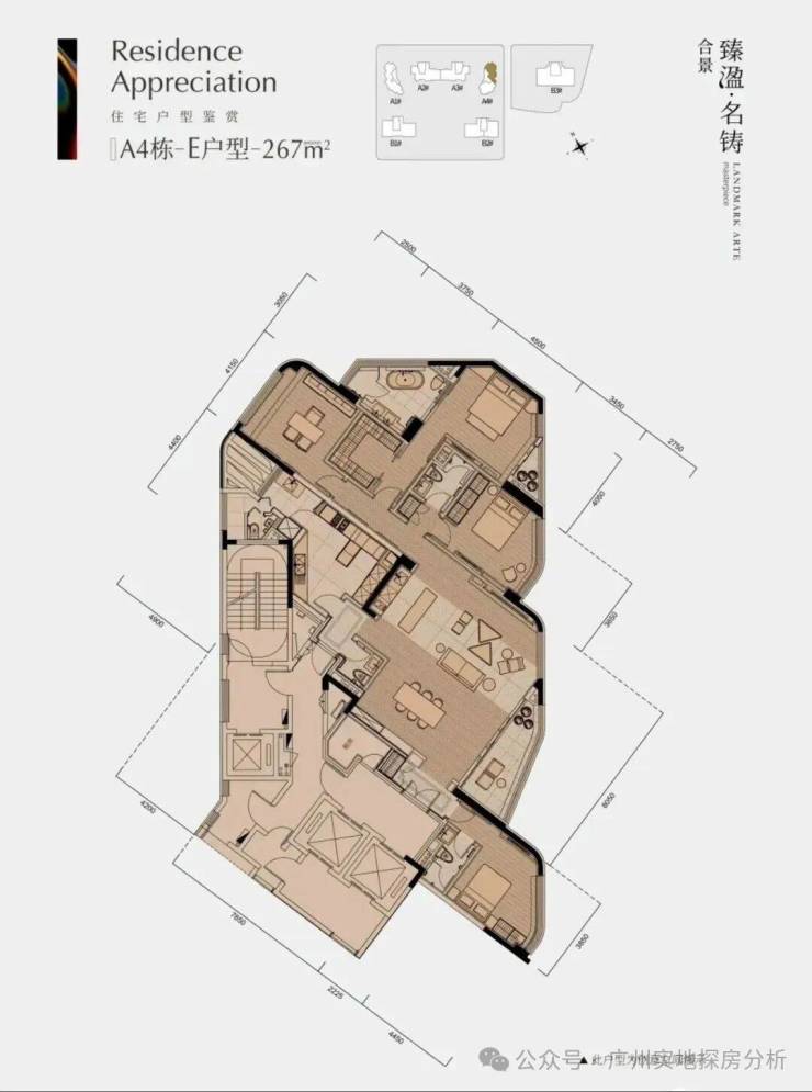 商业大平层有322平四房两厅五卫和403平四房两厅五卫两种户型,层高约3.5米。