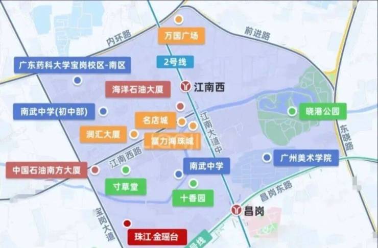 项目对面有昌岗中路小学和海珠江南外国语学校周边还有广州市南武中学、广州市第五中学广州市海珠外国语实验中学等学府。
