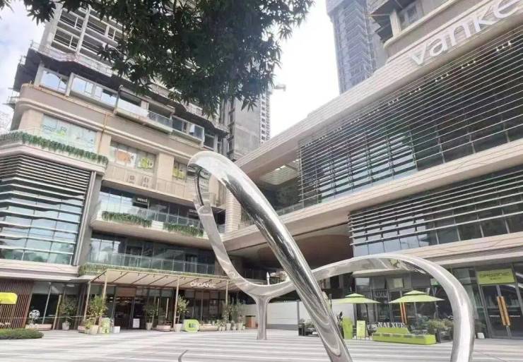 中央的“花地之心”雕塑,加上以铝合金线条点缀、采用莫兰迪色系的外观,视觉效果极具质感,已经颇有高端商场的气质。