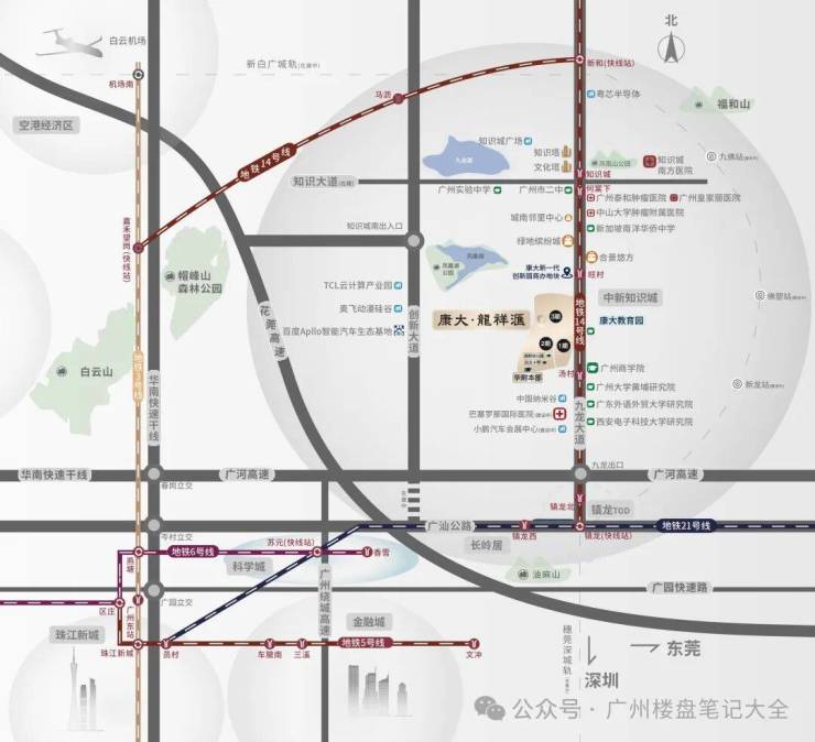 旺村、汤村双地铁口上盖,5站到天河。知识城主干道九龙大道,约2公里接驳广河高速,瞬达广州主城及粤港澳大湾区主要城市。