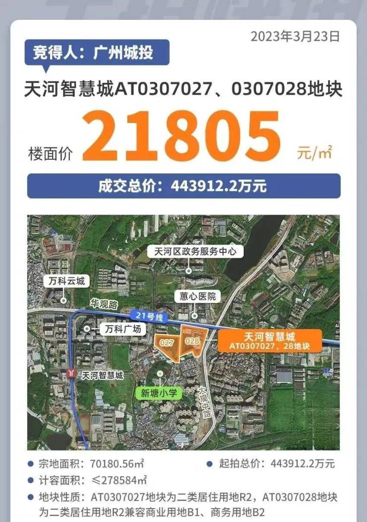 天禧这块地是2023年3月广州城投地产以44.39亿拿下的。除去配建,折合住宅楼面价约3.71万/平。项目位于天河智慧城核心区域,广州第三经济发展中轴核心,拥有国家级高新区和省级高新区,并被授予国家产业基地等7个国家级和5个省级创新发展平台,与珠江新城CBD共同构成“一区双核”的发展格局,将成为广州新的经济增长极。