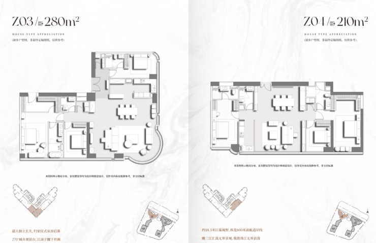 其中280㎡四房配备270°弧形观江客厅与全景落地窗,江面视野超1000米,直抵珠江入海口;
