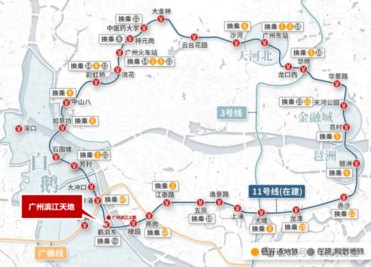 广州11号线以及佛山11号线鹤洞东站双地铁上盖,3横2纵大路网+公交站场+水上巴士,集水、陆、轨等多维交通方式于一体,半小时城央生活圈,1小时湾区生活圈。 11号线共设32个站点,全长44.2km,途径天河、白云、越秀、荔湾和海珠等5个含金量极高的区域,并连接广州火车站、广州东站等交通枢纽。
