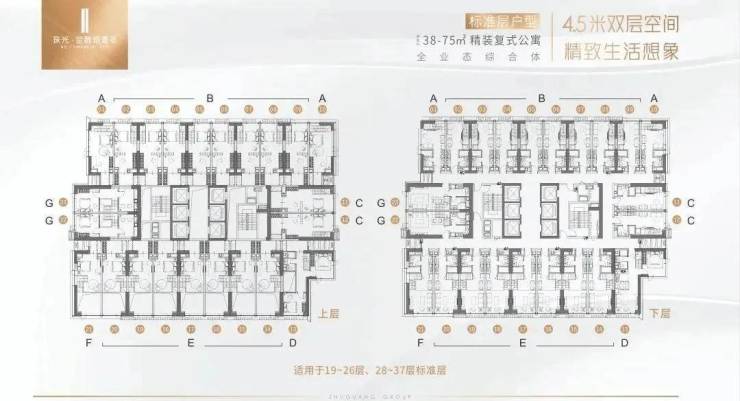 5栋小户型公寓,总高37层6梯23户,南向(50、75㎡);北向(40㎡;22~26层41、81㎡复式);