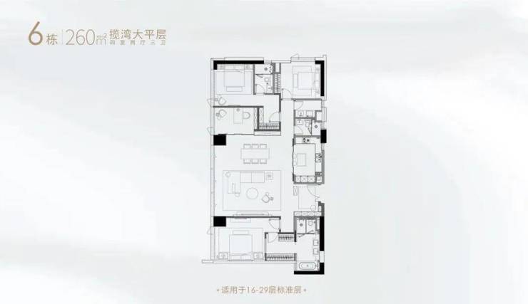 6栋望江公寓,总高43层,15、30楼是避难层,24年6月交,中区(16~29层:206、232、261㎡,5梯4户);低区(3~14层:98、146、143、151、161 ㎡,3梯7户,在售10、11楼)