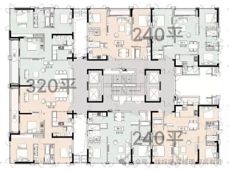 240㎡户型采用四房三厅双套间设计,由原本126㎡和114㎡两户打通合并而成,实现2梯2户的专属电梯配置。该户型使用率高达76%,配备阳台,带精装修,所有房间均享有无遮挡的一线海景。