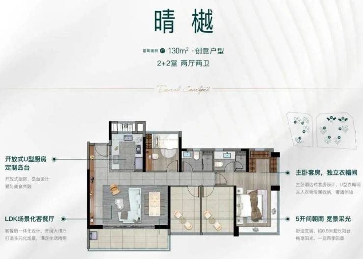 做到了5开间朝南,加上6.5米长的阳台,整个户型的通透感、采光性非常好;开放式U型厨房、定制岛台,让大汗淋漓的做饭变成边交流边享受美食的美好生活场景;LDK客餐厨一体化设计、开阔的大横厅,可以打造多元化的场景,满足不同的生活需求……