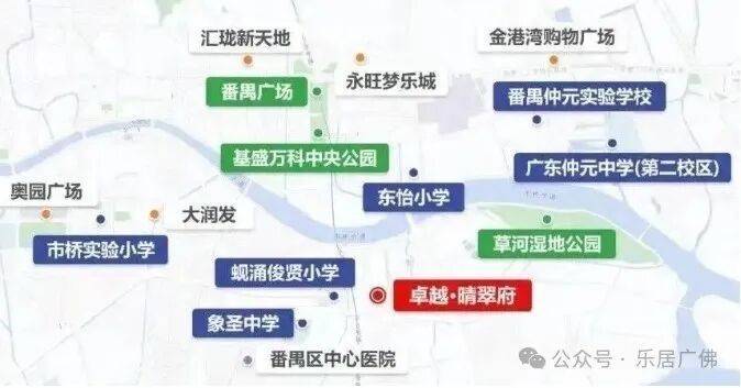 卓越·晴翠府位番禺大道和市桥河交界处。属广州番禺广场板块,享6公里河岸线,周边4大商业、2所医疗、4所学校环绕。由深圳开发商卓越集团负责开发。