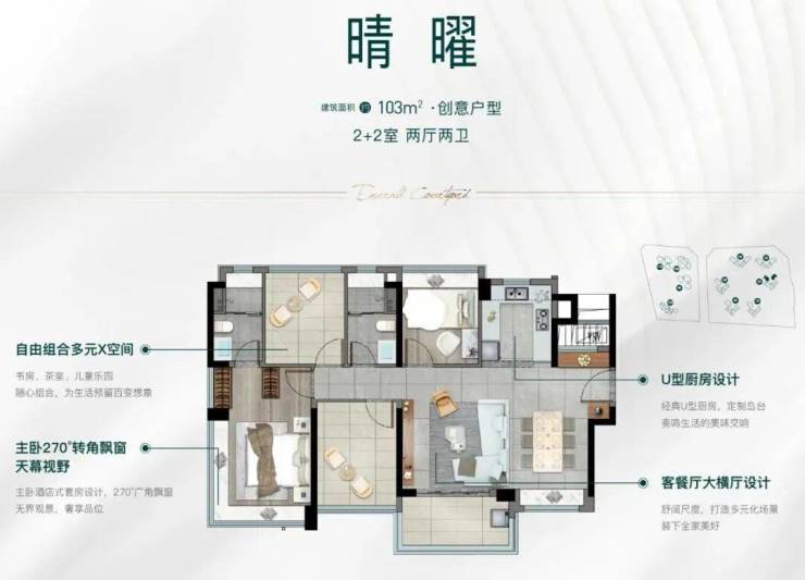 书房、茶室、儿童乐园之间自由组合的多元X空间,做到了多1房; 客餐厅的大横厅设计,空间感更好;主卧270°转角飘窗,带来更大的采光、景观面;U型厨房、定制岛台,可以让做饭充满乐趣……