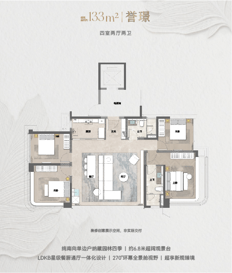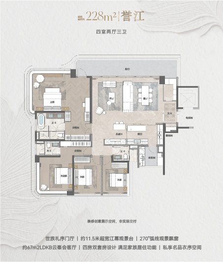 228㎡四室两厅三卫:配约 11.5 米超宽江幕观景台、约67㎡LDKB 云峯会客厅,双套房设计满足家族居住需求;205㎡四室两厅三卫:以42㎡洄游方厅、10.5 米奢阔观景露台为核心,强化空间通透感;133㎡四室两厅两卫:纯南向园景单边户,6.8米超阔观景台+LDKB一体化设计,兼顾实用性与景观体验,适配不同改善客群需求。
