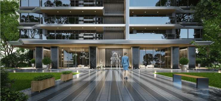 首层质感石材铺装与玻璃、铝板形成高阶材质碰撞,强化厚重品质感,以独树一帜的设计语言,打造出金融岛标志性豪宅形象,尽显不凡格调与尊崇气场。