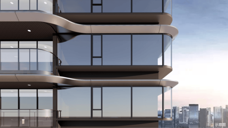 建筑外立面主打“现代精奢+滨水美学”,采用非对称布局,营造“大实大虚”通透视觉效果,横向线条舒展,落地玻璃窗与 270°转角全景窗无缝衔接,让江景与自然光成为空间主角,成就宽幕观江的极致体验。